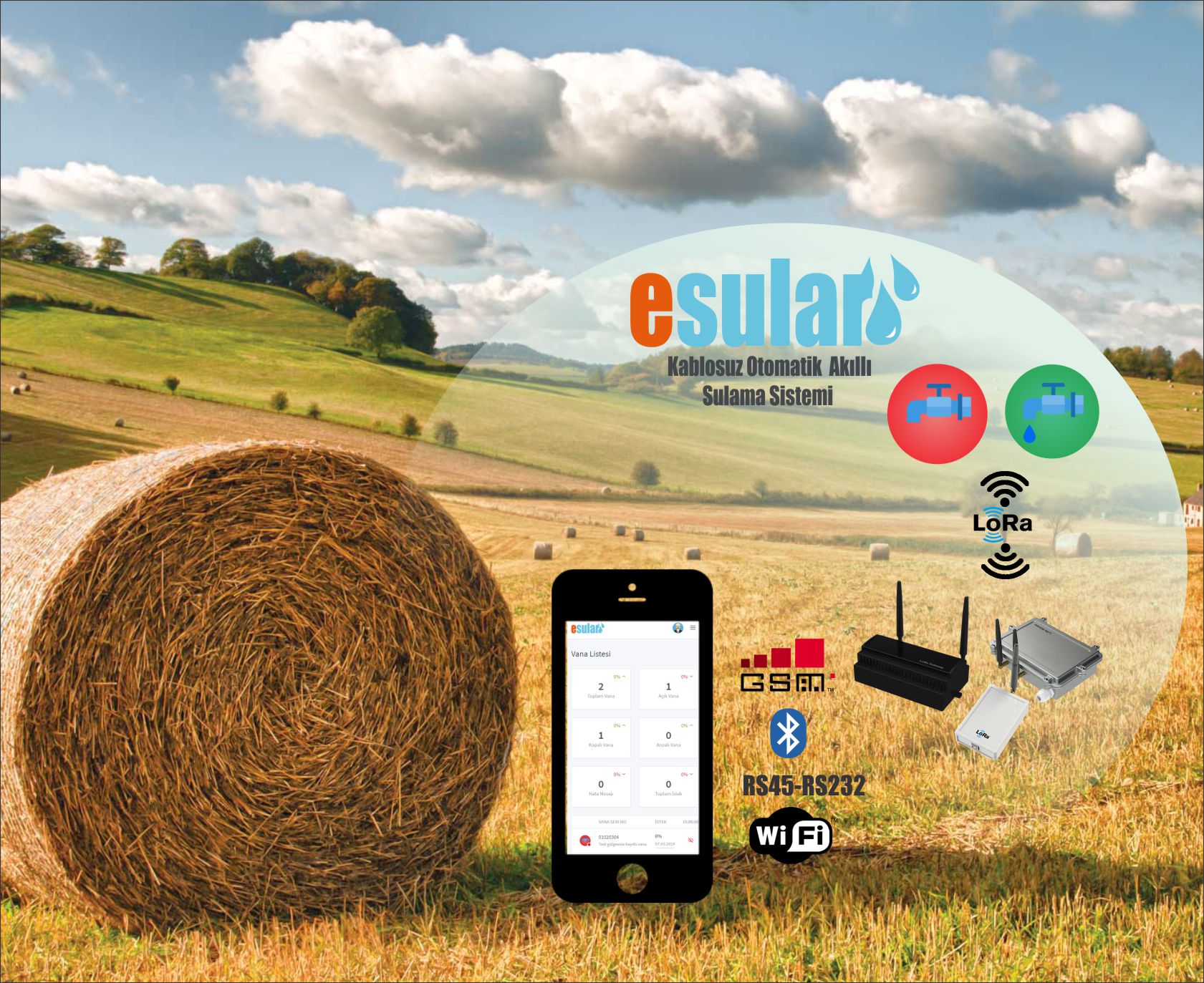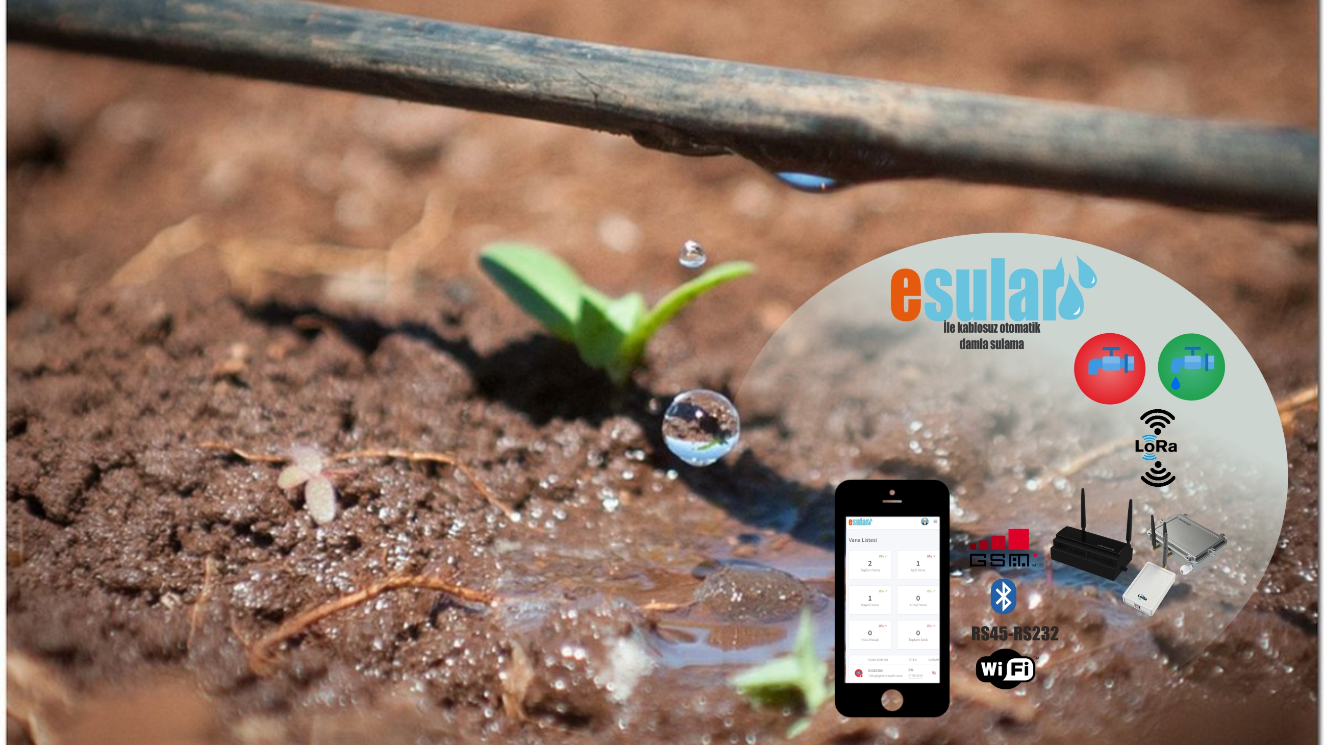 esular, sulama senaryoları, hava nemi, toprak nemi ve yağış durumu gibi geri bildirimler ile şekillendirilen kablosuz tam otomatik akıllı sulama sistemidir. Firmamız tarım alanları, seralar, parklar ve bahçeler için kablosuz sulama, pompa kontrol, ve sensör çözümleri geliştirmektedir.