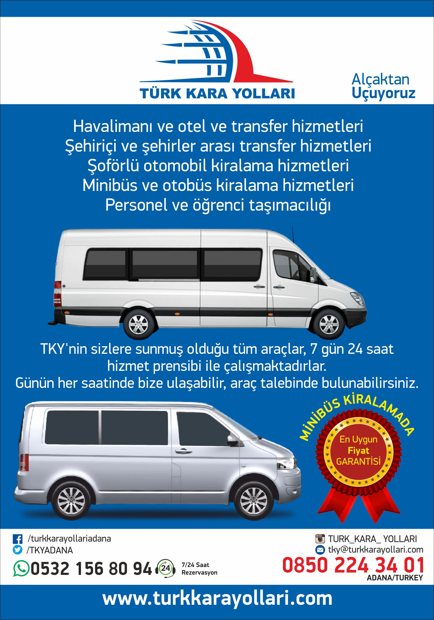 TKY'nin sizlere sunmuş olduğu tüm araçlar, 7 gün 24 saat hizmet prensibi ile çalışmaktadırlar. Günün her saatinde bize ulaşabilir, araç talebinde bulunabilirsiniz. Havaalanı, otel, liman ve şehirler arası transfer taleplerinizde, tur ve gezi organizasyonlarınızda, şehir içi ulaşım ve personel servisi taleplerinizde ya da kişiye özel sürücülü otomobillerimizle de yanınızdayız.